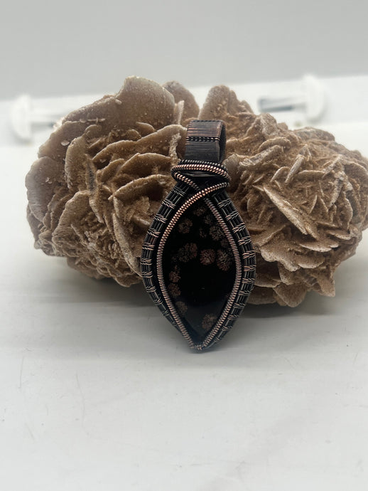 Hand Carved Firework Obsidian Oxidized Copper Wire Wrap Pendant