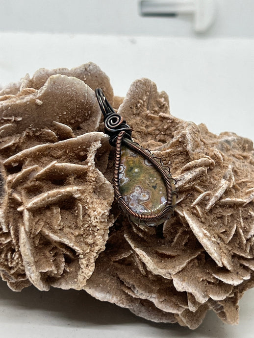 • Hand Carved Crazy Lace Agate Copper Pendant